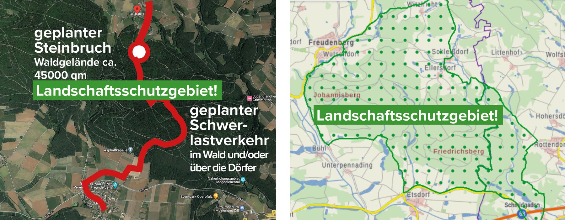 Hier soll über Jahrzehnte Godelmann-Schwerlastverkehr auf ca. 4 Km durch das Landschaftsschutzgebiet geleitet werden. Die Transporte würden über einspurige, steile Waldwege der Bay. Staatsforsten, der Waldbauern und über Feldwege der Gemeinde Freudenberg führen.